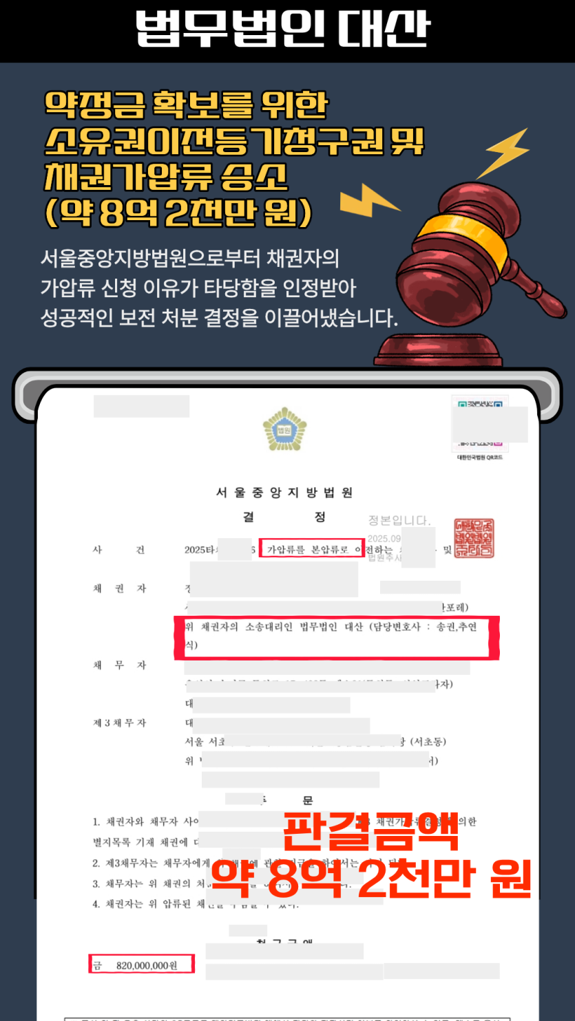 약정금 확보를 위한 소융권이전등기청구원 및 채권가압류 승소